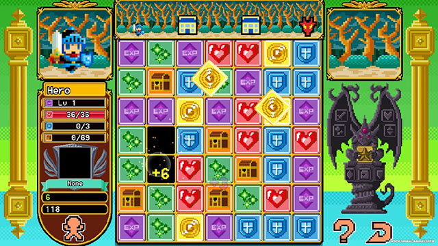 《方块传奇DX(Block Legend DX)》是Alvin Phu开发的一款集RPG与Popstar式消除于一身的像素风游戏。在游戏中玩家扮演的是一位在不同地图穿梭,讨伐魔兽的勇者。剧情听起来是不是很有典型RPG游戏的感觉呢?在勇者的冒险旅途中,能够使用铁剑和黄金剑攻击敌人,用盾牌保护自己,还能用魔法对敌人造成魔法伤害,或治愈自身的伤势。一路上,勇者还会遇见宝箱,捡到金币和回复道具。但这一切都需要靠玩家点击消除图标,勇者才能做出相应的举动。