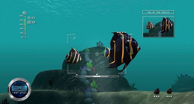 玩家在游戏中需要完成各种海底的拍摄任务来赚取星星,右下角有玩家的任务说明以及对应的星级奖励,获得这些奖励来为你购买胶卷以及氧气等等。