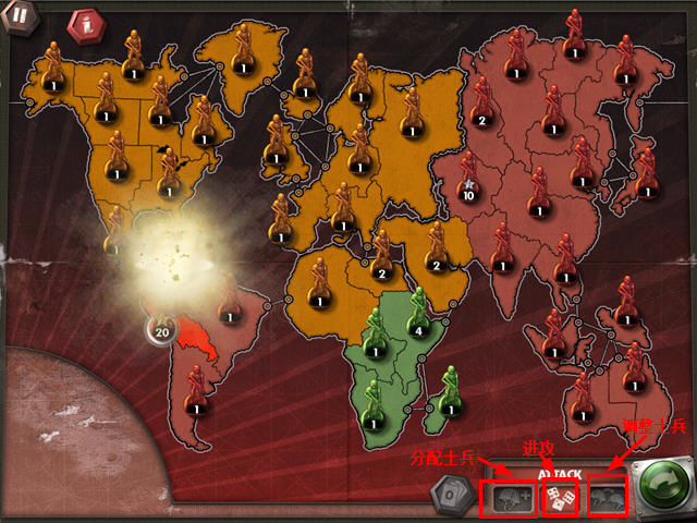 第一个为分配士兵,为每一回合的开始,你可以分配士兵以及合成卡片,至少三种卡牌才能够合成,卡片合成后玩家会获得大量士兵奖励用以分配。