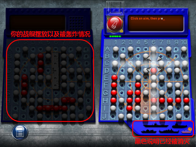 目的为轰炸掉对方所有船舰,右下方会显示对手还剩余的船舰,黑色为已经被消灭。