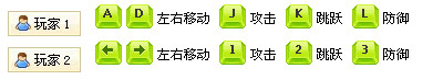 玩家二:方向键←→控制移动,小键盘1键攻击,2键跳跃,3键防御。