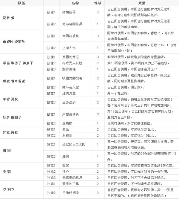 胜利条件详细分为以下两种1、对手的灵玉变为0或以下。2、比赛规定的幕数结束,玩家的灵玉比对方多。特殊的,若规定的幕数结束后,双方灵玉相等时,采用以下规则判定。a、游戏中双方和牌的番数×10+符数累计,数字大的获胜。b、若a相同,则双方和牌中宝牌(dora)和里宝牌(ura)累计,数字大的获胜。c、若b也相同,则不分胜负,进入延长战。d、延长战始终表示为alllast(○幕的第四局目),每一局都回复满灵力。e、延长战将持续到分出胜负为止。 角色技能