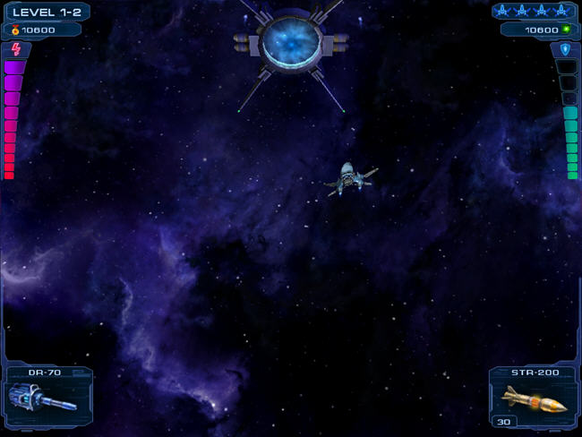 游戏的故事是:驾驶飞船穿越 5 个巨大的银河系(共 50 游戏关卡),击败外星人,寻找传说中的武器。囧。。每一个关卡都很短。过关之后可以购买升级武器,武器有 Laser,Rocket,Droid。关于 Droid 是比较有创意的,我买了一个,Repare Droid 估计是修复飞船用的。还有武器型的 Droid。它会跟紧紧跟随在飞船的后面。