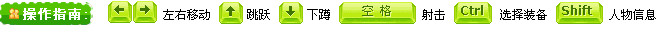 键盘方向键←→键控制移动,↑键跳跃,↓键下蹲,空格键射击,Ctrl键选择装备,Shift键显示人物信息。