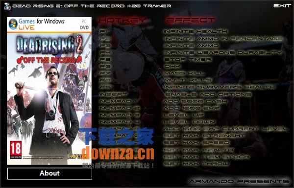 《丧尸围城2:绝密档案》修改器使用说明:F1 无限生命F2 无需装弹F3 无限子弹F4 无限武器耐久度F5 时间停止F6 一击必杀F7 大量杀敌F8 多重杀敌F9 幸存者无限生命