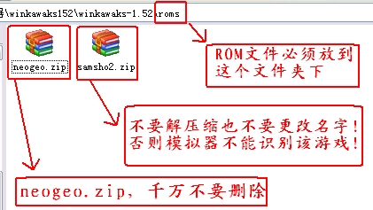 2, 本身roms文件夹里有个neogeo.zip,千万不要删除,否则模拟器不能识别SNK的游戏,例如KOF系列…… 3, 将下载到的KAWAKS游戏ROM,放到上面说的roms文件夹下,注意,ROM是ZIP格式,但是不要解压缩也不要更改名字,否则模拟器可能不能识别该游戏,比如下载《侍魂2》得到的文件是 samsho2.zip,就直接放到roms文件夹里面,不必为了方便记忆而改变ROM名称,模拟器会自动识别并显示游戏名字的。如图: