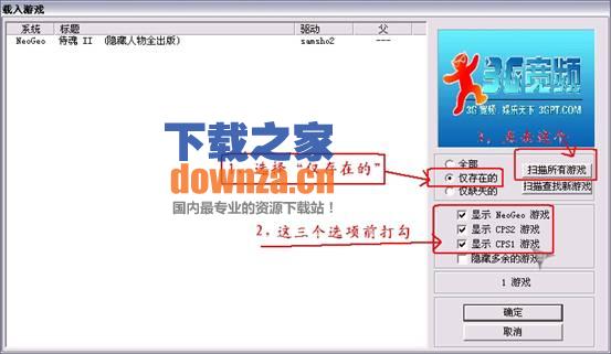 5, 点击载入游戏后会出现下面的对话框,按照图示的设定设置好你的模拟器后,首先选“仅存在的”然后在下面的“显示CPS1游戏” “显示CPS2游戏” “显示NEOGEO游戏”三个选项前打勾,最后点击“扫描所有游戏”